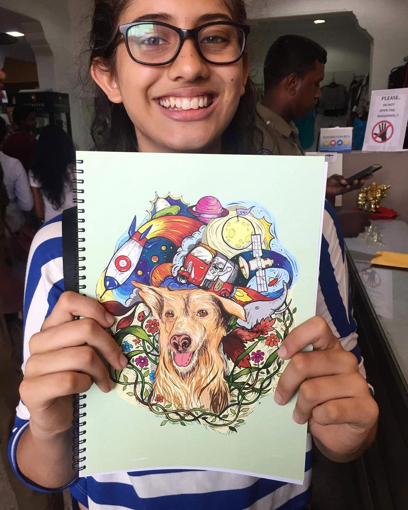 A private commission for a digital illustration, requested by a mother for her inventive young daughter. She insisted the inclusion of their beloved dog Luna and some of her daughter's favourite things; tuk-tuks, space voyage, flora and fauna